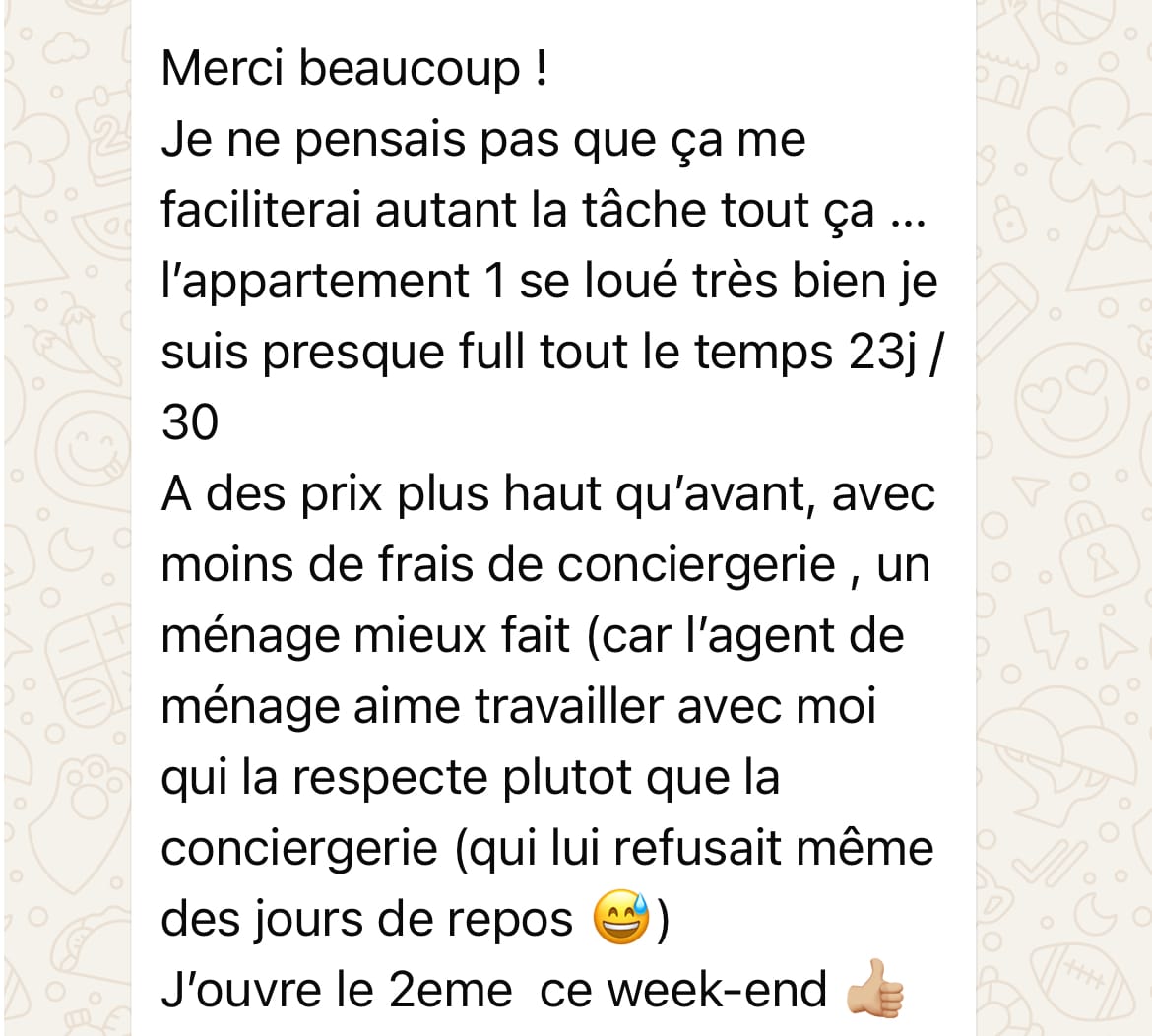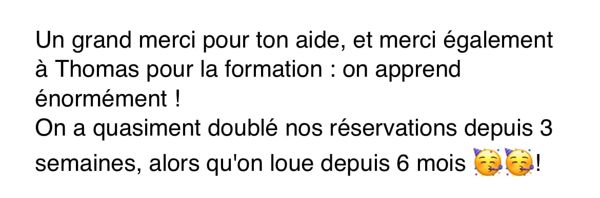 Aujourd’hui, notre mission est simple : aider les hôtes et conciergeries à rejoindre les 10 % des propriétaires de biens locatifs en courte durée qui performent vraiment, en partageant nos meilleurs outils, les stratégies et les méthodes qui ont fait nos résultats. Depuis 2019, nous avons déjà formé plus de 600 hôtes et conciergeries en Francophonie.